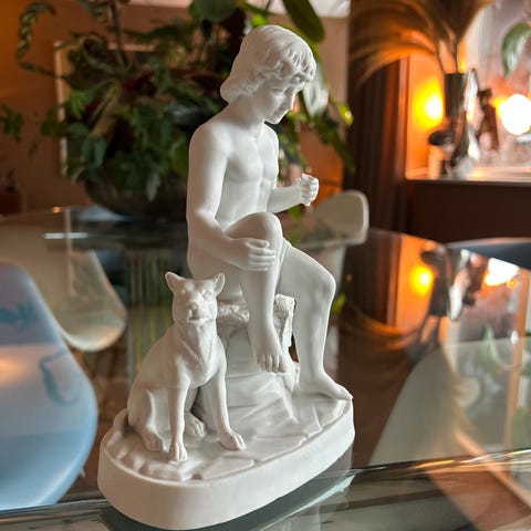 Jeg selger en antatt Royal Copenhagen figur basert på modellnummer 3505, kjent som «Den lille hyrdegutt». Denne tidløse skulpturen i klassisk bisquit-porselen er inspirert av Thorvaldsen. En flott tilføyelse for enhver samling av dansk porselen!17 cm i høyde.