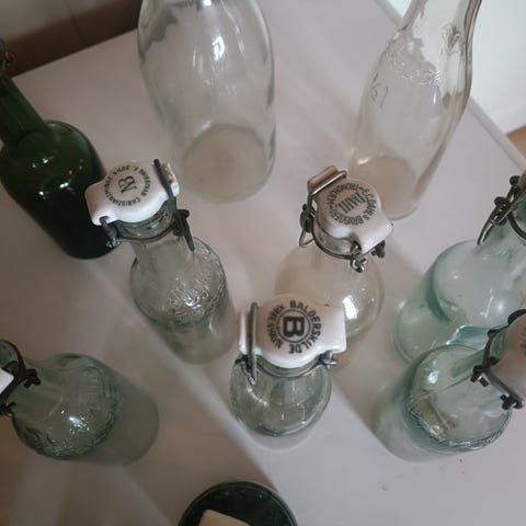 Britiske flasker i keramisk materiale med ulike etiketter. Flaskene har en vintage stil og kan brukes til dekorasjon eller samling.