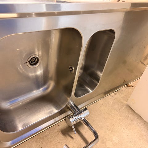 Grå benkeplate i vinkel (venstre) og planlimt vask (60cm) laget for frittstående komfyr(høyre) komplett med vannlås og spennbeslag til sammenføyning. 3 cm tykkelse .