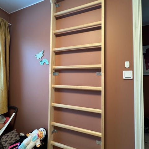 Består av to kraftige glideskinner, en polstret pute med fire hjul og to håndtak. Leveres med opphengsbrakett for vegg, med fem ulike høydealternativer. Kan også festes i en ribbevegg el.