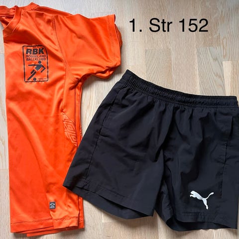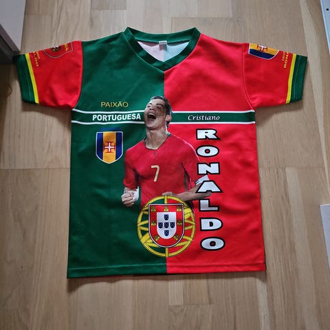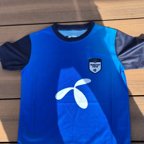 Fotballtrøye for barn i størrelse 158. Trøyen har blå farge med rødt og hvitt vertikalt stripe-design. Godt brukt. Vært populær. Kjøpt i Spania for noen år tilbake