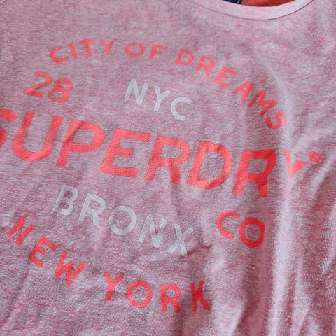 Kul Superdry T-skjorte i størrelse 36 for dame. T-skjorten er mintgrønn og laget av bomull, med trykte detaljer i rosa og sølv.