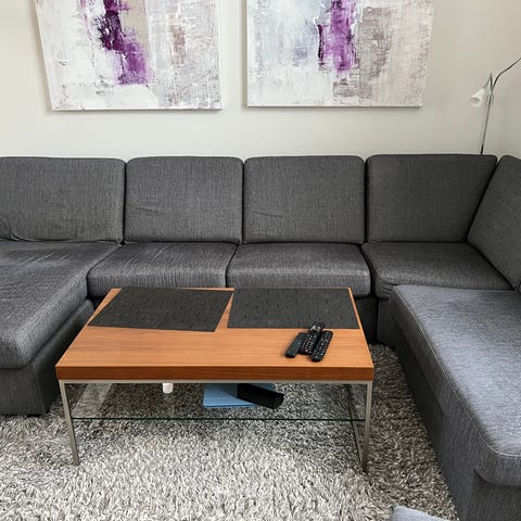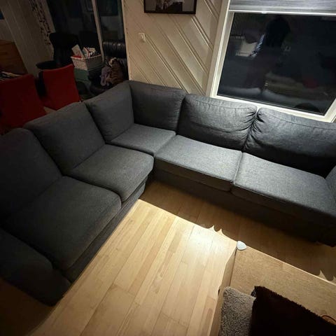Pent brukt grå hjørnesofa med puff selges. Den har veldig god komfort og er i god stand. Den har ingen tegn på slitasje eller bruksmerker.