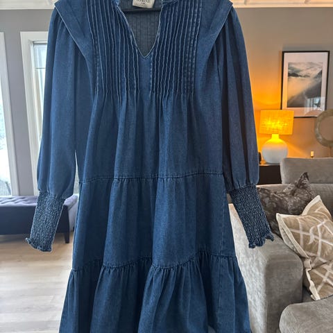 OSMINE af Nor hverdagskjole i blå bomull, størrelse 36. Kjolen har lange ermer med flotte mansjetter og en løs passform med rysjer. Laget i mykt dongeri stoff.