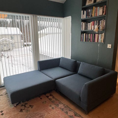 Hjørnemodulen har en flekk på setet som vi ikke har klart å få bort, og stoffet er noe falmet.