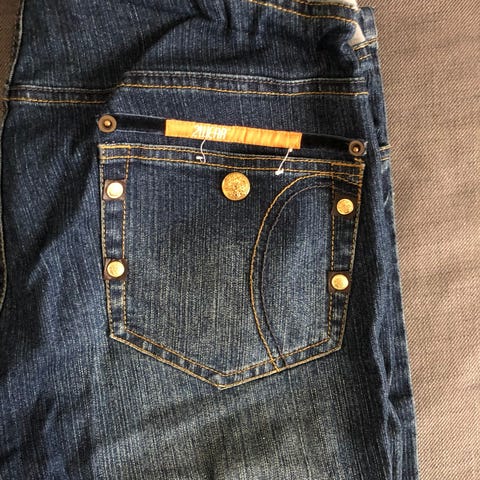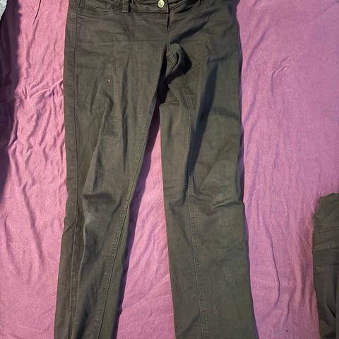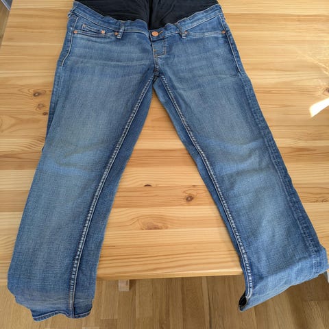 Fine gravid olabukser i mørkeblå farge. De er kjøpte i Barcelona fra merket Prenatal. De er lave, går under magen i steden for over hele magen som mange andre gravidbukser gjør.