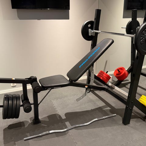 Pro-Form treningsbenk med justerbar ryggstøtte og sete. Benken har svart polstring med blå detaljer og en solid ramme i metall. Egnet for ulike styrketreningsøvelser.
