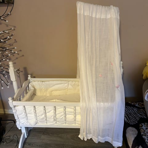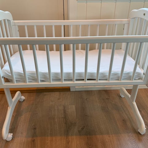Babyvugge med mulighet for vippefunksjon. Med madrass. Noen bruksmerker på selve vuggen, men fremstår ellers i god stand.