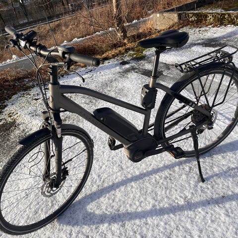 Sykkelen ble brukt daglig det året i forbindelse med jobb, deretter vært oppbevart inne en periode på grunn av vinter, og bare vært brukt inni mellom for korte turer til butikken og hjem igjen på våren/sommeren/høsten. Nå har den stått lagret i boden 1 helt år på grunn av operasjon av skulder og derfor selges den videre. Vi har vært veldig fornøyd med sykkelen og ikke opplevd noe negativt med sykkelen. God sitte og kjørekomfort, og god støtdempere. Trengs en vask