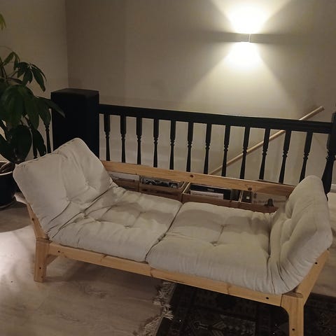 Yttermål når den står slått opp som seng er ca 205x132 cm
