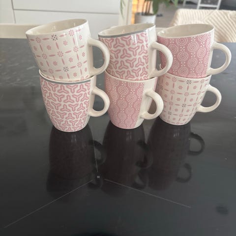 Ellos kopp i keramikk med dekorative mønstre i svart og hvitt. Settet består av 12 kopper som kan brukes til varme drikker som kaffe eller te. Ingen bruksmerker.