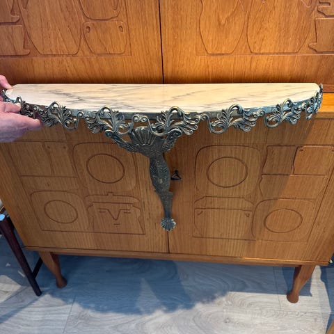 Kjøpt i juni 2024 så er super tilstand og selges kjempe billig mot henting. Det er et pent og stilrent hylle/kommode med et luksuriøst uttrykk. Mørk trefinish på sidene og front, kombinert med en svart toppplate med marmormønster og dekorative, gullfargede rammer som går rundt front og topp.