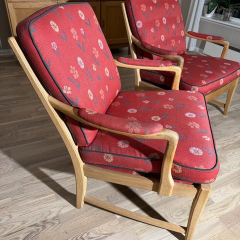 To lenestoler laget for å vare, dette er kvalitetsmøbler i hel eik hvor man kan trekke om puter for litt nyere stil. selges samlet