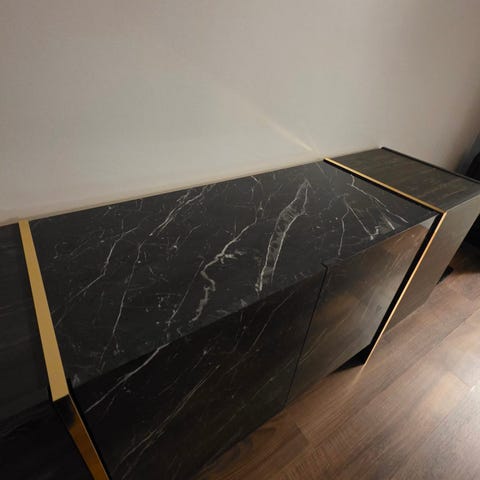 Kjøpt for 6mnd siden så er i god tilstand og selges kjempe billig mot henting. Det er et pent og stilrent hylle/kommode med et luksuriøst uttrykk. Mørk trefinish på sidene og front, kombinert med en svart toppplate med marmormønster og dekorative, gullfargede rammer som går rundt front og topp.