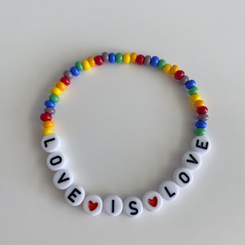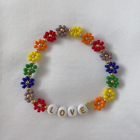 Håndlaget, elastisk pride armbånd med teksten love. Armbåndet er laget med glassperler, gullbelagt hjerte og bokstavperler av akryl. Det er ca. 18 cm. Smykkepose medfølger🛍️