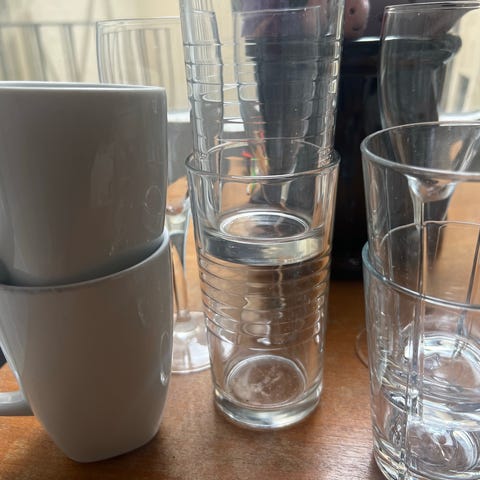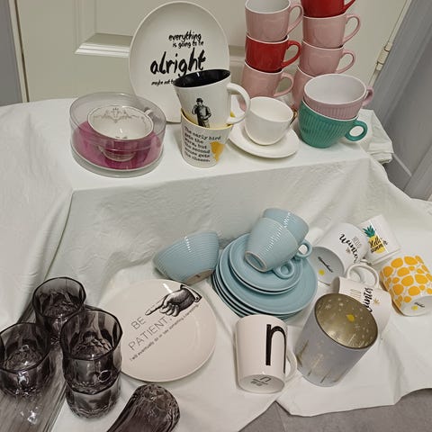 IKEA kopp og glass sett med flere kopper i ulike farger og flere klare glass. Passer til daglig bruk i kjøkkenet.