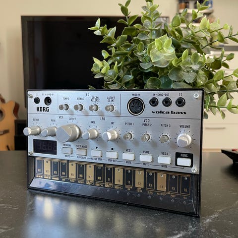 Korg Volca FM synthesizer med innebygd sequencer og flere kontrollmuligheter. Kompakt design og ulike justeringsknapper for lydforming og sequencing.