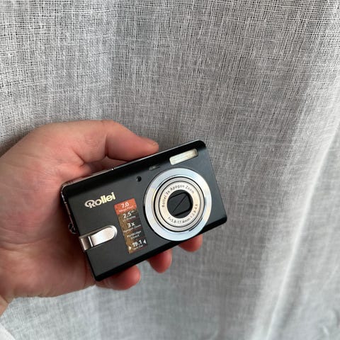 Det følger med etui, kabler, ladestasjon til batteri, batteri og 2Gb minnekort.