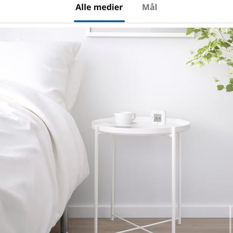 IKEA GLADOM sidebord med hvit overflate og metallramme. Rundt bord med enkel og funksjonell design, egnet for bruk som sidebord i ulike rom.