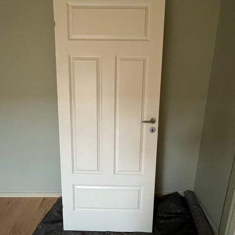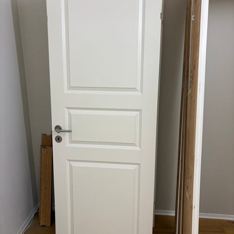 Solid innerdør formpresset. Ny, bare montert. Har noen mangler: utskjæringer på undersiden, synlige på bildene. Kan enkelt sparkles. Hvit farge.