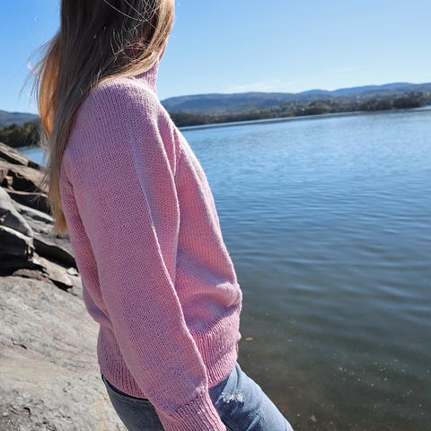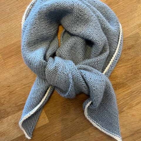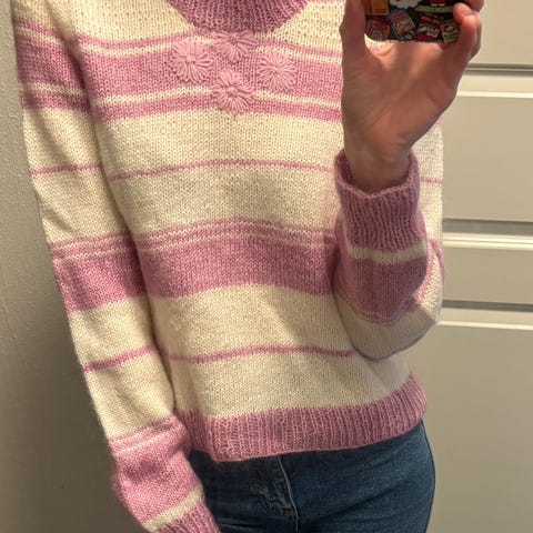 Strikket i en varm hvitfarge i bunnen og med flerfarget garn i mønsteret.