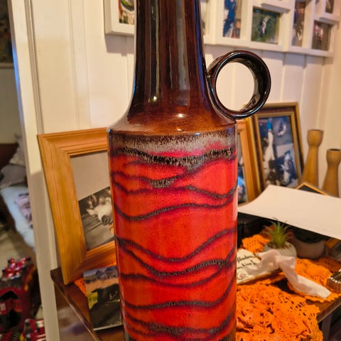 Meget pen vase i brun fra tyske Sawa Keramikk.. Noen ørsmå bruksmerker, men ellers fri for skade. Vasen har en hank og en pen dekor. 36 cm høy.