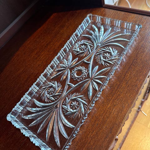 Nydelig sett i klart glass bestående av ett rundt fat og ett fat på stett, begge med vakkert preget blomstermotiv og dekorativ kant. Klassisk og elegant uttrykk som passer perfekt til servering av kaker, frukt, dessert – eller som dekor i vitrineskap eller på bord.