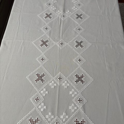 Hardangersydd duk i hvitt og brunt med hullbroderi