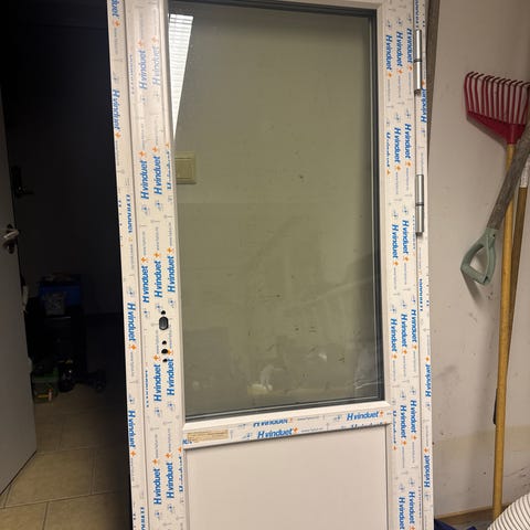 Høyde 209 ,bredde 199. Koblet glass, kittet utvendige ruter. Produsert ca 1986. Stått montert på innsiden av overbygd balkong,så lite utsatt for vær og vind. Vrider og låser trenger litt justering.