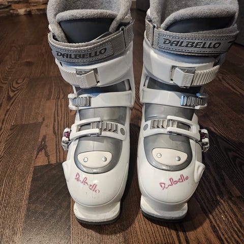 Dalbello jente skistøvler i størrelse 33. Skistøvlene er hvite med rosa detaljer og har spenner for justering og god passform.