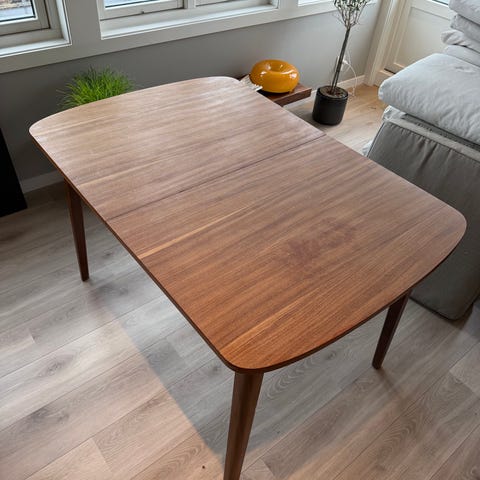 Gir bort et klassisk spisebord fra den anerkjente norske produsenten Gustav Bahus Eftf. Dette er et tidløst møbel med det ikoniske stjernemønsteret i finéren, som gir stuen et varmt og stilig retro-preg.
