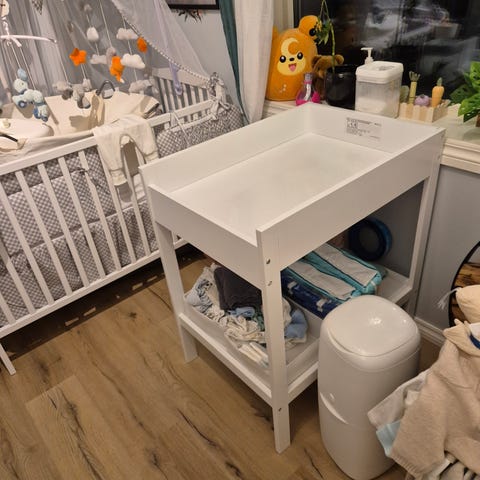 4moms Baby Swing med grått sete og treramme. Produktet har et komfortabelt sete med sikkerhetssele og inkluderer hengende leker for barnets underholdning. Designet med en rund treramme som gir stabilitet og moderne utseende. Egnet for små barn. Jeg kjøpte den ny i september i fjor, for cirka 2 000 kroner.»