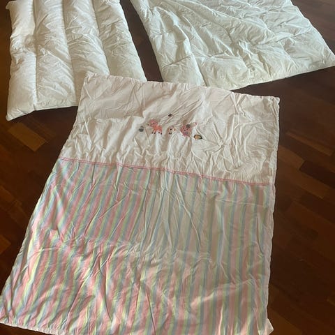Søtt baby sengesett i hvitt m lillarosa ugler til baby i myk bomull. Likt mønster på begge sider. Mål: Putetrekk 44 x 35 cm. Dynetrekk 73 x 88 cm. Pent brukt av enebarn og ingen slitasje eller nupper.
