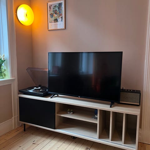 TV-benk med tre glasshyller og metallramme. Designet for plassering av TV og tilbehør. Farge på glasshyller er mørk, og rammen er i metall. Passer til stue eller mediarom.