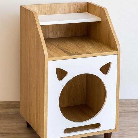 Møbelet fungerer både som et praktisk nattbord og en trygg, komfortabel hvileplass for katten. Overflaten er behandlet med vannbasert, luktfri og usynlig lakk som beskytter treverket uten å endre det naturlige uttrykket. Lakken er trygg for innemiljø og behagelig for både mennesker og dyr. Kan produseres i ønsket farge.
