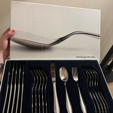 Hardanger bestikksett med 24 deler. Settet inkluderer kniver, gafler og skjeer i rustfritt stål. Designet for bruk ved måltider og samlinger.