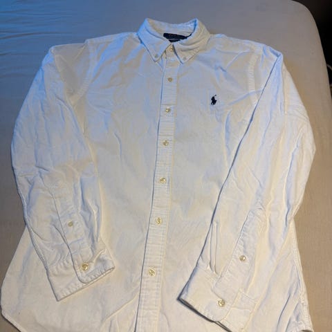 2 stk Ralph Lauren Polo Slim Fit skjorte i størrelse M, farge hvit og blå, laget av bomull. Skjorten har klassisk design med knappestolpe og brodert logo på brystet. Den er egnet for formelle og uformelle anledninger.