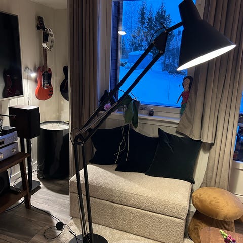 Veldig stilig stålampe som fungerer veldig fint. Stoffkledd lampe. Tre foter, og den ene sitter dessverre veldig løst. Med en to åring i hus passer det veldig dårlig for oss om dagen. Selges pga det og at vi skal flytte.