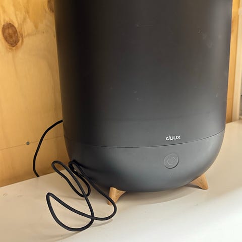 Duux DUH2011 luftfukter i hvit farge. Enheten har kontrollpanel med flere funksjonsknapper og leveres med fjernkontroll. Strømforsyning: 220-240V, 50Hz, 20W. Produktet er designet for innendørs bruk for å tilføre fuktighet til luften.
