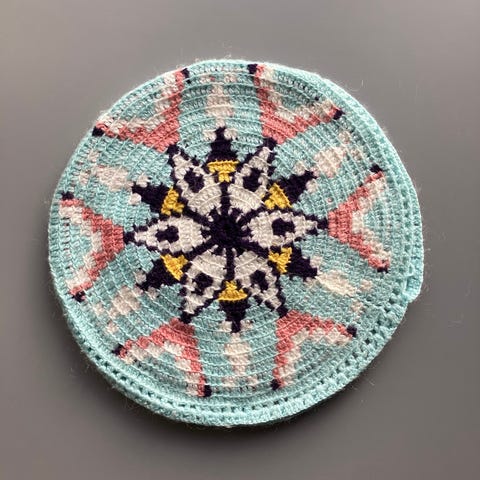 Håndlaget heklet rund putetrekk med fargerikt mønster på forsiden og baksiden.