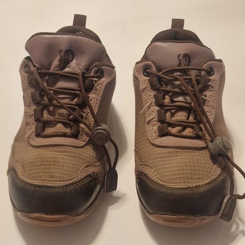 Merke: Okaki. Lite slitasje på sålene. Det er et lite hull øverst på høyre sko og slitasje på strikk. Se eget bilde. Selges derfor rimelig.