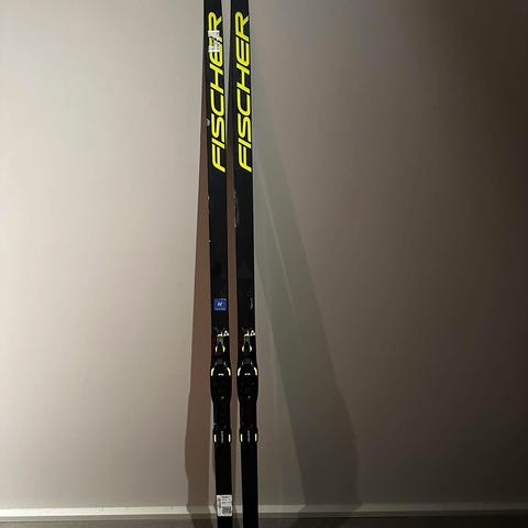 Fischer Speedmax langrennsski med bindinger og staver. Skiene har en lengde som passer for langrenn, med et design som inkluderer svart og gul farge. Stavene er svarte med justerbare stropper for håndgrep.