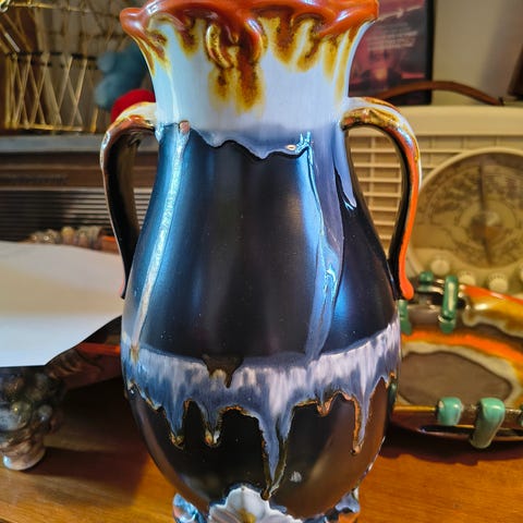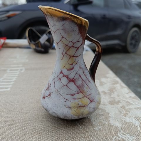 Herlig brunfarge med fin relieff mønster i dekoren. Denne har glans glasur oppå. I toppen er det noe man kan kalle hvit lava glasur. Ca. 37,5 cm høy. Fri for skade.