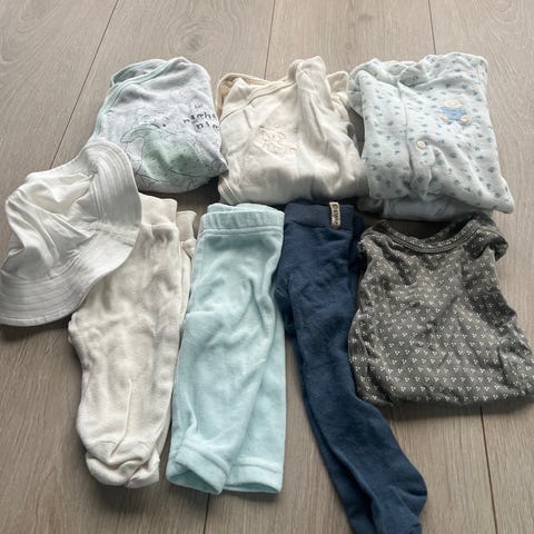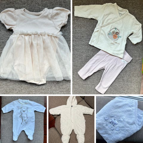 Selger denne nydelige klespakken og noen fine tepper til baby. Alle klærne er i str 56 og luene er i nyfødt størrelse 0-2 mnd men kan ofte brukes lenger:)