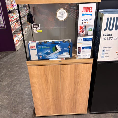 Juwel Lido 200 akvarium med glasskonstruksjon. Passer til ferskvanns- og saltvannsakvarier. Egnet for hjemmebruk eller kontormiljøer som dekorasjon eller akvariehobby.