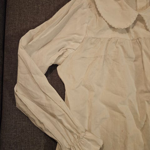 ⭐️Kjolen er hvit og laget av bomull. Den har lang erm og en krage med detaljert kant.