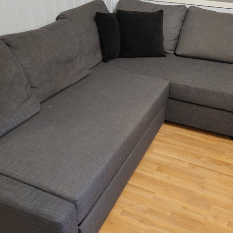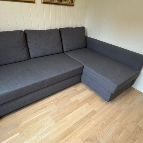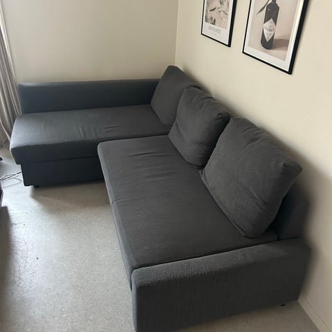 Pent brukt 3-seters sovesofa med stofftrekk i mørk grå. Sofaen er med sjeselong og omgjøres enkelt til seng. Overmadrass kan kjøpes mot et tillegg og gjør den til en fullverdig seng. Med oppbevaringsrom til for eksempel overmadrass . Sjeselong kan speilvendes etter ønske. Liggemål 140x195 cm. B230 x H83 x D88/150 cm.