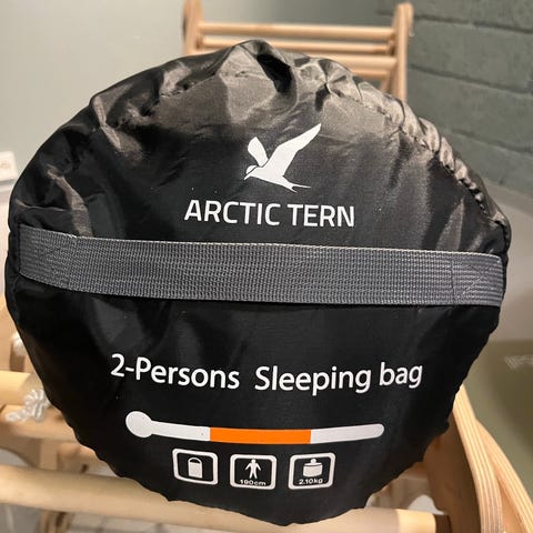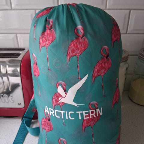 Arctic Tern sovepose med turkis farge og rosa flamingomønster. Inkluderer oppbevaringspose med samme design. Denne kan brukes som sekk av barnet, så soveposen er lett å få med seg (og veier ku 0.7kg). Veldig pent brukt.