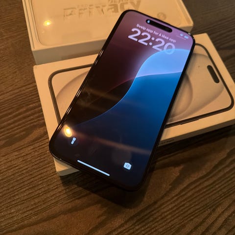 Apple iPhone 16 Pro Max mobiltelefon med 128 GB lagringskapasitet. Enheten har en svart Titan farge.Telefonen har trippel kameraoppsett på baksiden.