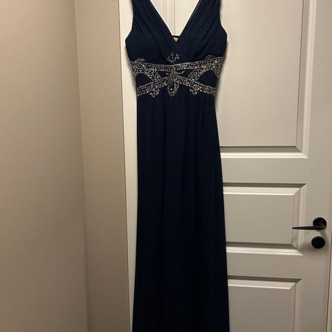 Zara kjole til spesiell anledning i størrelse M, fargen blå, laget av polyester. Kjolen har detaljer i blonder og perler på overdelen . Brukt 1 gang.